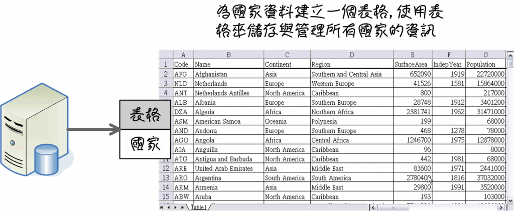 以儲存世界資料的資料庫來說,你想要把世界上所有的國家、城市和語言資料,在這個資料庫中儲存與管理。所以你會針對國家資料的部份,在世界資料庫中建立一個儲存國家資料的「表格、table」: