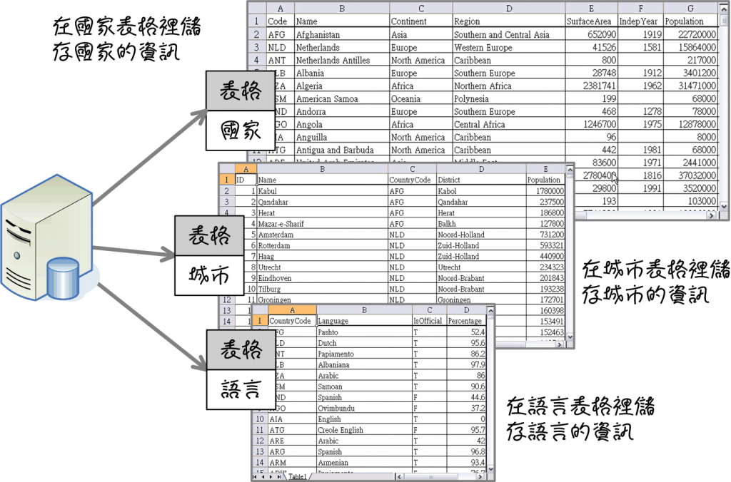 你不太可能把一個洲的國家資料,儲存為一個工作表檔案;就算你這麼作了,如果你想要查詢人口數小於十萬的國家時,你會發現這會是一件很困難的工作。