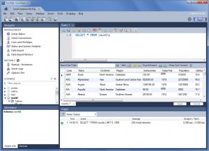 連線到資料庫後,在左側的World資料庫名稱上點兩下(Double click),會發現World會變成粗體字,表示目前開啟(作用中)的資料庫。在畫面中輸入一個測試的SQL敘述,SELECT * FROM country。輸入完後,按下執行敘述的快速鍵Ctrl + Enter,就可以看到所有的國家資料: